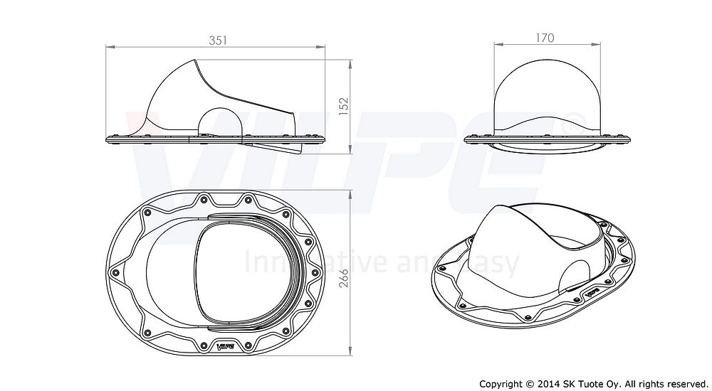 The Classic pass-through set is designed for the pass-through of standing seam roofings for VILPE® P-type pipes and roof fans with a diameter of 110 - 160 mm as well as for aerial sleeves. The width of the Classic pass-through is 266 mm and the length 328 mm. The Classic pass-through set can be retrofitted as the pass-through of felt roofing.